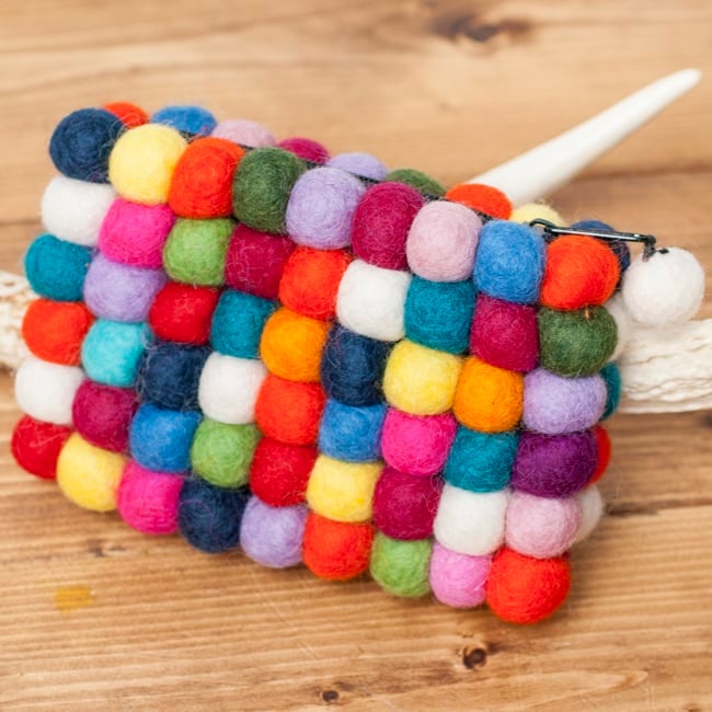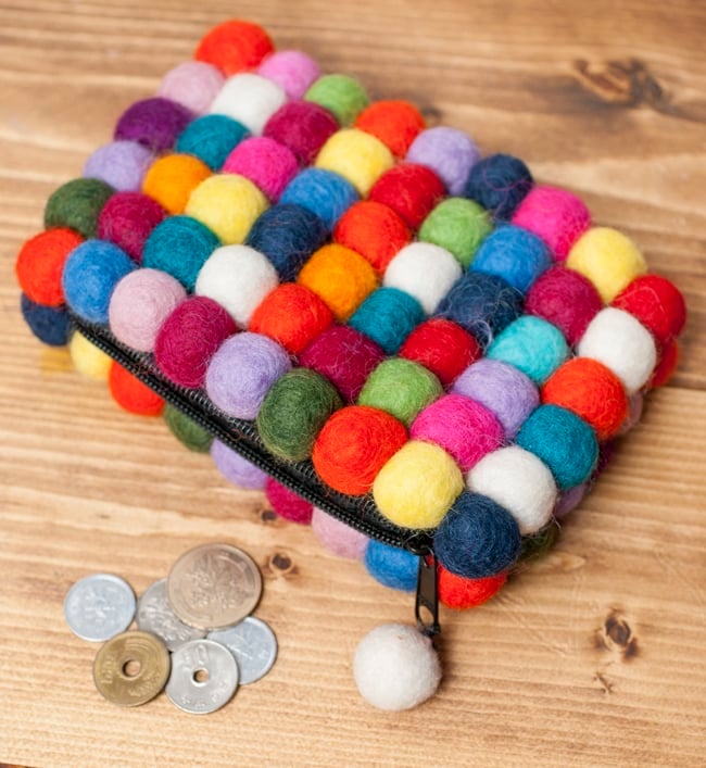 可愛い!と思わず手にとってしまう、カラフルなまん丸フェルトのポーチです。ポーチ表面のカラフルなボールは、一個一個、ネパールのお母さんたちが羊毛を手で丸めていったもの。もこもこの質感がなんとも言えない温かみ。可愛らしいシルエットに惚れて、大切に使いたい一品になるに間違いありません。■バッグの中でも存在感大。