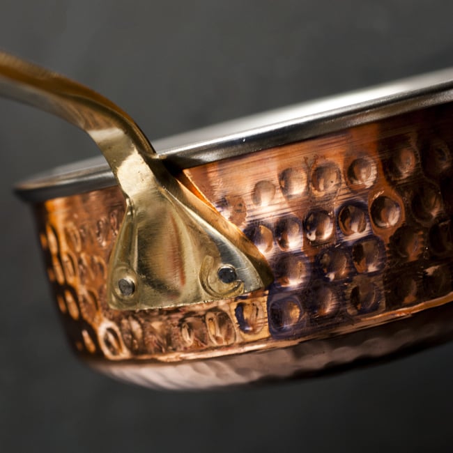 銅装飾が施された美しい片手鍋です。内側は重厚なステンレス、外側は熱伝導率の高い銅を用いたハイブリッドなソースパン。更に槌目で美しく模様を彩った、グレードの高い仕上がりです。毎日使う台所道具だからこそ美しい物を揃えたいという人にぴったりのキッチンウェアですね。持ち手部分もスマートに引き締まっており、プロフェッショナルのぴりっとした空気感があります。エネルギッシュでカオスな印象のあるインドの、いつもとは少し違う側面を見せてくれる高級な一品です。