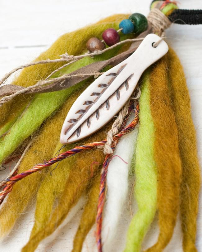 拡大写真です。白いモチーフは水牛の角で作られていて、独特な光沢と、さわると少しひんやりとするかわいいモチーフです。