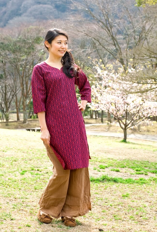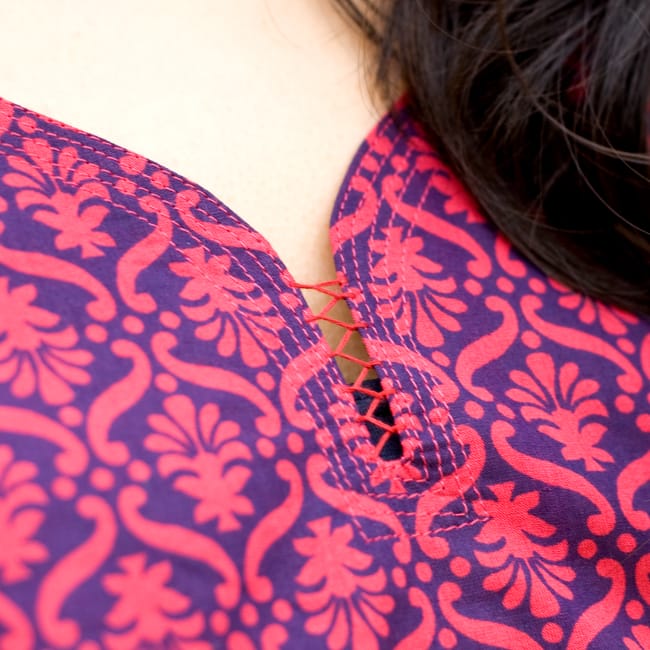 インドでクルティと呼ばれ、若い女性がおしゃれに着こなしているインド版のチュニックです。コットン製で、肌触りもよく着やすい1枚です。長袖デザインなので、春先や秋口にぴったりです。サイドには深みにはいったスリットもあり、足さばきも快適です。深めのスリットなので、必ずボトムスを合わせてお楽しみ下さい。■胸元の糸編みもポイント