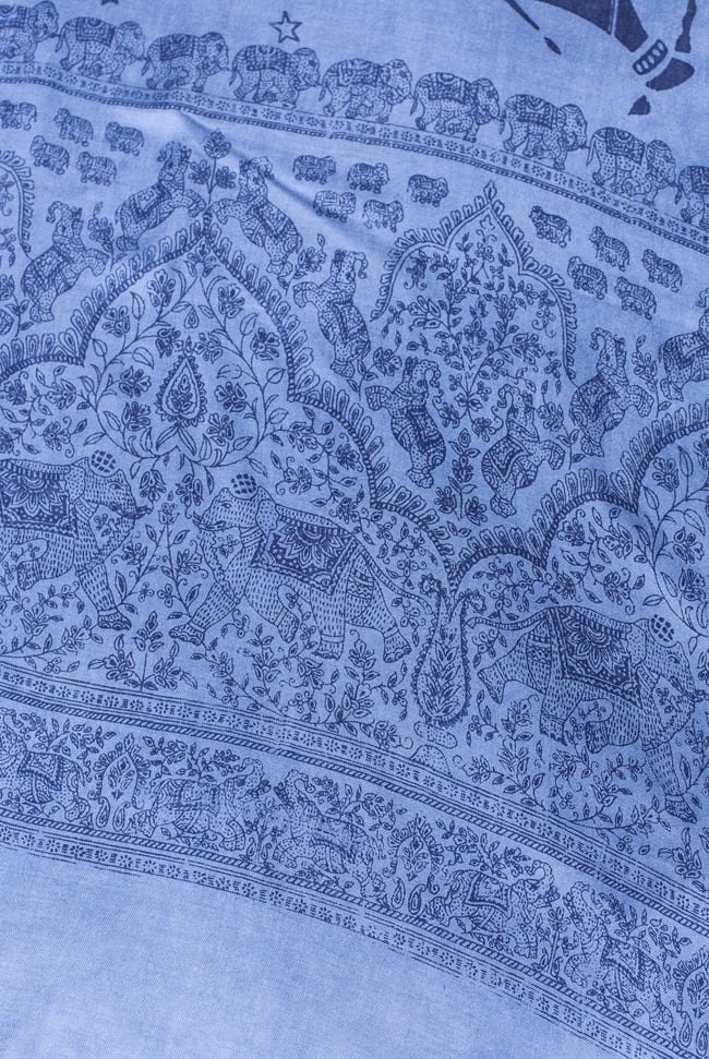 大きな樹木と象をモチーフにしたなめらかな手触りの便利布です。大きさは横1m、縦2m位の一番使いやすいサイズ。複雑に見える紋様の中にも象さんが練り歩いていて象好きにはたまらないファブリックです。ハート形をした大樹に2頭の象が寄り添い、空には星々がきらめいています。物語を感じるデザインですね。ショール風に体に巻いたり、野外キャンプ時に日よけにしたり、頭に巻いてターバン風にしたり、 カーテンの代わりにしたり、ほこりよけとしてパソコンの上にかけたり、かばんの中に入れておいてちょっとした暖をとるのに使ったりと本当に自由自在です。色違いで何枚も欲しくなる、とっても便利な布です。