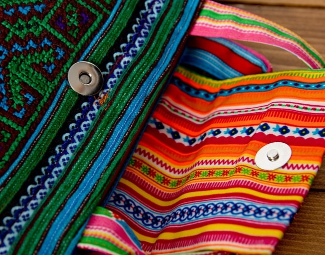 細部に至るまできちんと作られている上質なモン族刺繍のバッグです。モン族の好きなプリント布、モン族刺繍の布地等を組み合わせたカラフルな一品で、シンプルな服装にもエスニックな格好にもマッチします。持ち手や力のかかりそうな部分には丈夫な合皮を使用。内部には携帯をいれるためのポケットと小さなジッパー付きのポケットがあるので小さなものも鞄の中で迷子にならず便利です。