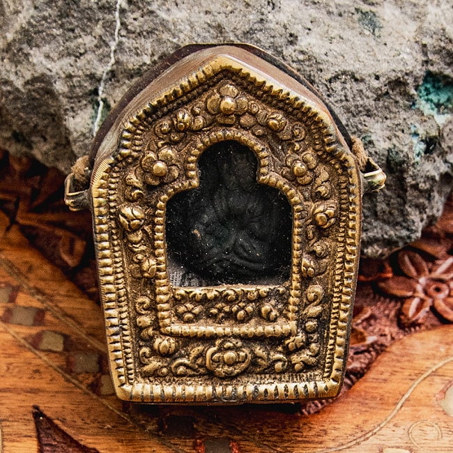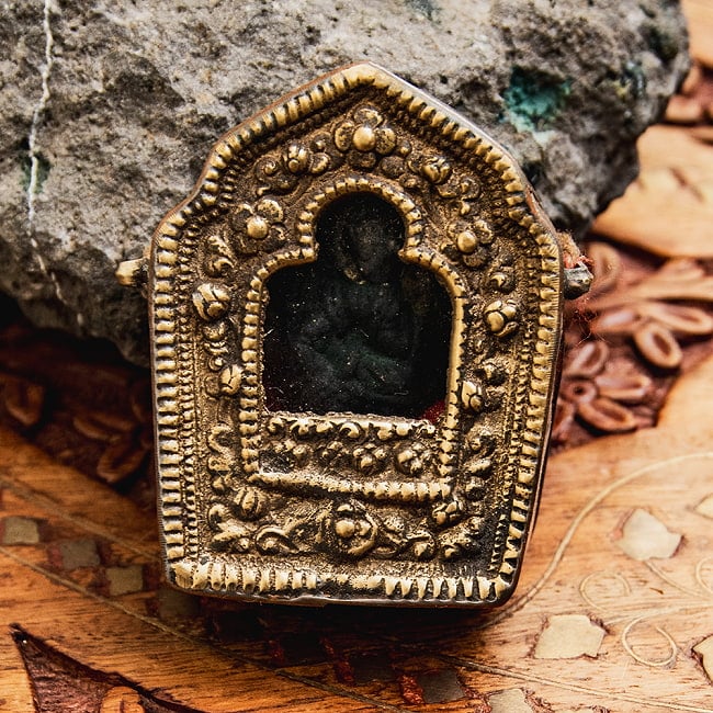 これは携帯できる祭壇ガウといいます。チベット、ネパール、ブータン、インドなどの仏教徒の間ではメジャーなものます。日本では仏具店でもあまりお目にかかることが出来ません、ちなみに日本では厨子(ずし)のひとつとして扱われます。この仏具の役割は2つあります。ひとつは「どこでもお祈りができること」、そして「お守り」として使えるということ。先程述べた仏教徒の間では家の大きな仏壇に供えたり、旅先に出かける時に心臓に近い部分に帯などで括り使われます。また災厄を退けると考えられています。とてもわかりやすく言うと、キリスト教の十字架と日本のお守りをかけ合わせたものでしょうか。
