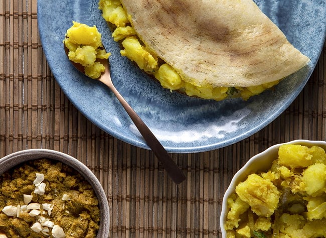 ドーサは南インドのクリスピーなクレープです。豆と米をすりつぶした生地を発酵させて、鉄板(タワ)の上に広げてパリパリに焼き上げたドーサはインド料理初心者にも食べやすく、北インドでも熱い支持を集めています。※ドーサはこのような感じで作る食べ物です