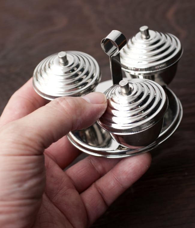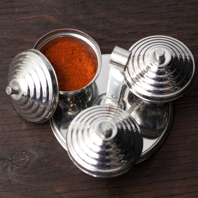 食卓にあると便利なマサラケース。蓋付きでとてもキュートな形状です。インド料理はターリー(丸いカレー皿)の上で混ぜながら食べるのが基本。ご飯にダールやカレー、ヨーグルトをミックスしながら味わいの変化を作りマサラの大海原を泳ぐのが醍醐味です。そんなとき少し辛さが足りなかったり香りにもう一押し欲しい時にこんなマサラケースがあると楽しいですね!