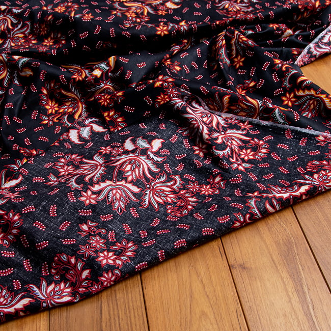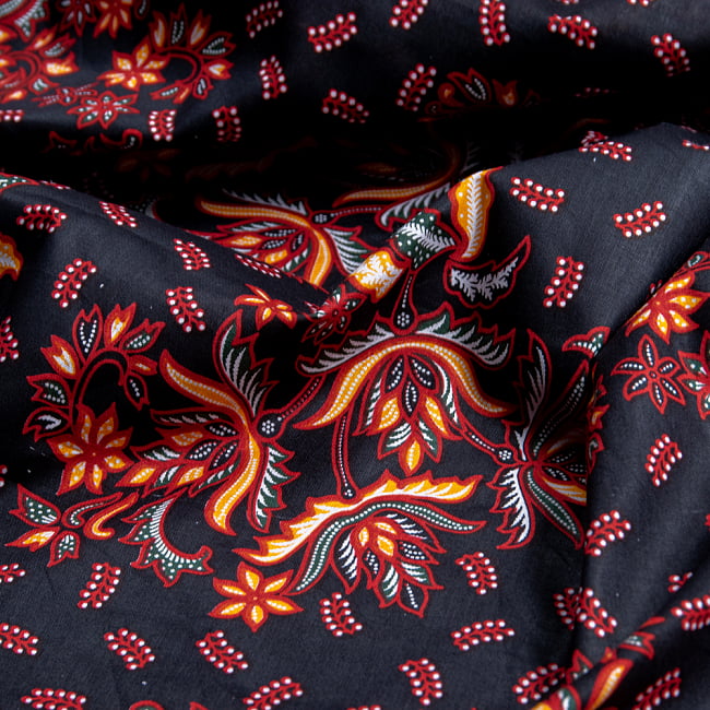 染めの部分が非常に独特なパターンを持つインドネシア伝統の染め方、ろうけつ染めをプリントして作成したアジア布のバティック。ジャワ更紗とも呼ばれています。インドネシアのバティックは、ジャワ王国の王宮文化が起源とされています。かつては、王宮の貴族のみが着用できるものでした。