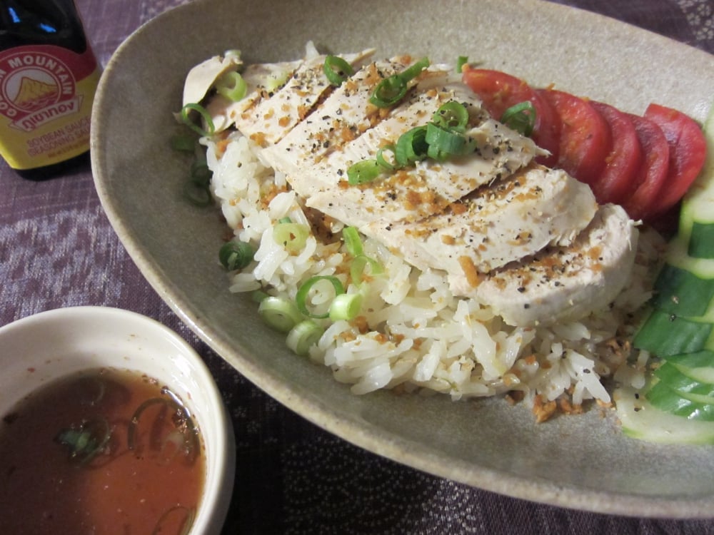 カオマンガイは、鶏肉とご飯を一緒に炊きあげた、タイのチキンライス。ナンプラーをかけていただきます。ご飯にしみ込んだ鶏ダシ、ふっくらしっとりの鶏肉が絶妙にマッチして本当に美味しい!!カオマンガイは、シンガポールチキンライスやマレーシアのチキンライスの派生系、起源は中国の南部だと言われています。その地方独特のタレ、つけ汁を使ったり、作りかたが若干違ったりするようです。