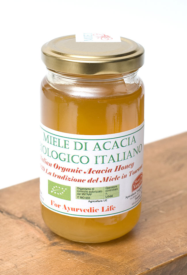 ご存知アカシアの花のはちみつです。非加熱でハチミツ本来の栄養と味をお届けします。火を入れていないはちみつは、アーユルヴェーダに最適です。
