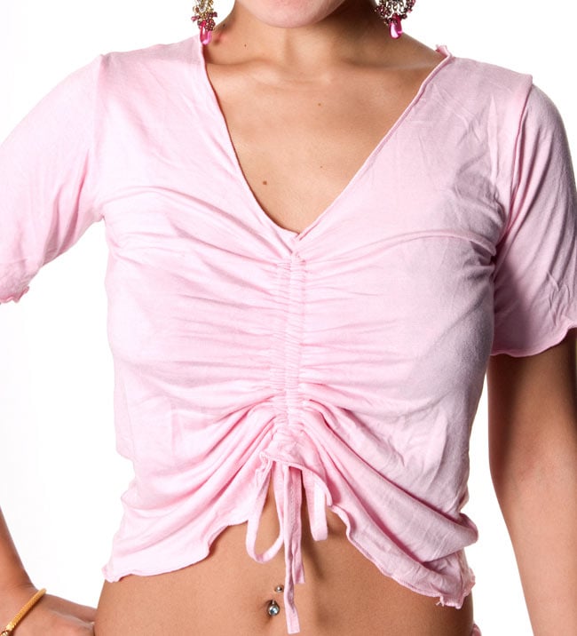 また、トップス前部のフロントラインをストリング出来、全体的に形を変形することが出来るので、用途や場面に合わせることが可能です。舞台衣装、ベリーダンスのレッスンウェアとして、ヨガやスポーツ、発表会など幅広い用途にお使いいただけるかと思いますので一着持っていると、とっても便利なウェアです。