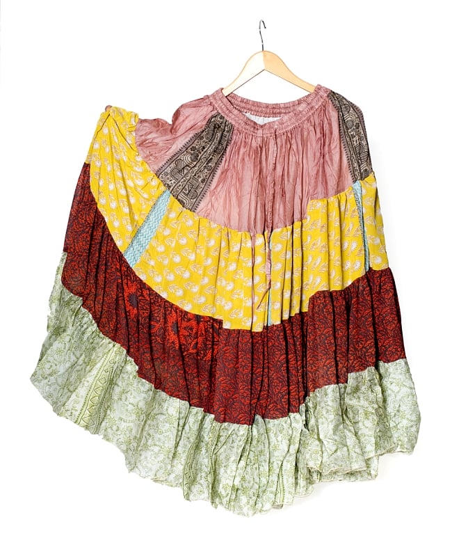 使われているサリー生地は層のようにトータル4種類。それぞれをつなぎ合わせたパッチワークになっています。さらに、アンティークサリーなので、それぞれが同じ組み合わせのない一点もの。自分だけの特別な1枚になりますよ。また、お送りするスカートは、ハンガーに掛けて片方を広げてある写真一枚目の物となります。