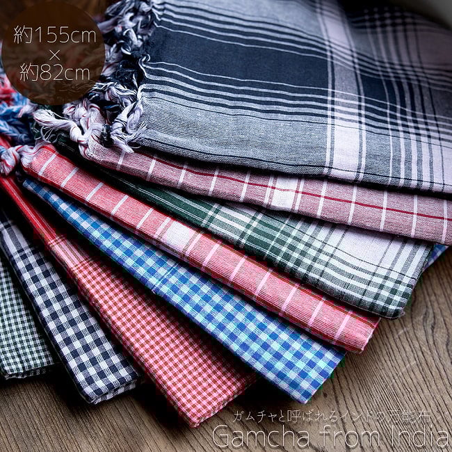 インドの生活感あふれる布、ガムチャと呼ばれる万能布で日本で言う手ぬぐいのような布です。シンプルでざっくりと編まれた鮮やかなチェック柄が可愛く、様々な用途にお使いいただけます。 現地では、祭壇に使用したり、頭に巻いたり、手拭きにしたり。色やサイズに合わせて何にでも◎ざっくりと編まれているから速乾性にも優れており、使えば使うほど、洗えば洗うほど生地が馴染んで柔らかくなってきます。お皿を拭いたり、目隠し布やランチョンマットのように広げて使用しても◎また、大きめサイズならクーラーの風よけや日焼け防止にも使用できます。