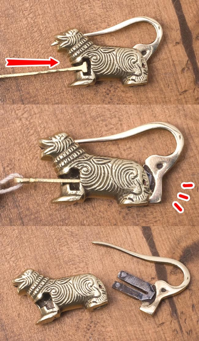インドやネパールで昔から使われている虎の形をした錠前です。虎の尻尾がフックになっていて、付属の特別な鍵でフックを外して錠をします(写真参照)。南京錠などとは違って、鋼のばねが閉じたり開いたりする事で、フックが外れたり外れなかったりする構造で「いやー良くできているなーと感心するばかり」。