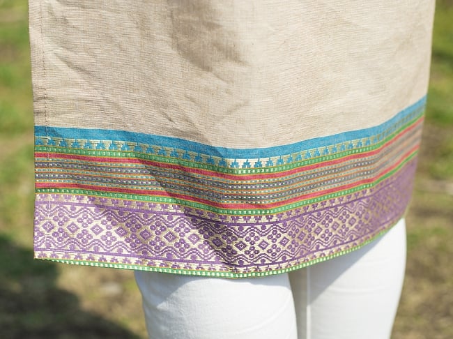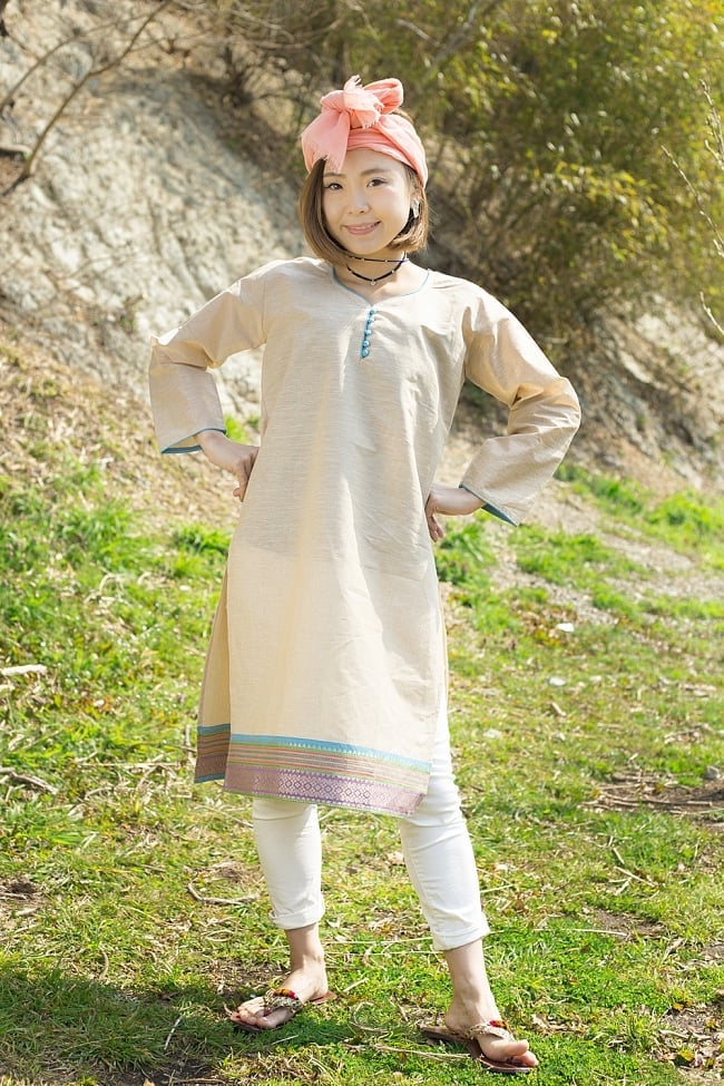 派手めの色合いが多いインド服ですが、こちらは普段着にも使える落ち着いた生成り生地の自然な色合いです。裾口のボーダー飾り(「ザリ」と呼ばれています)が華やかで、すらりとしたシルエットに良く映えます。丸みのある襟元やボタン風の飾りもキュートですね。| ブランド | TIRAKITA ( ティラキタ ) |
