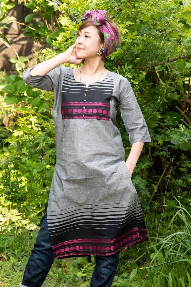 グレーを主体とした落ち着いた色合いのクルティがインドはデリーから届きました!インドの衣服は派手目のカラーリングが多い中、シックで大人の感覚を楽しめる色使いはとてもめずらしいですね。シンプルな色使いは普段着にもぴったり。秋・春に嬉しい一着です。■クルティと呼ばれるインドのチュニック
