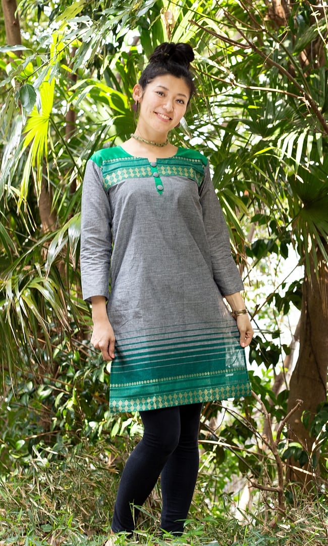 シックな色合いが素敵なクルティです。身長165cmのモデルさんの着用例です。こちらは選択H-1:格子模様・緑金(シンプル袖)です。