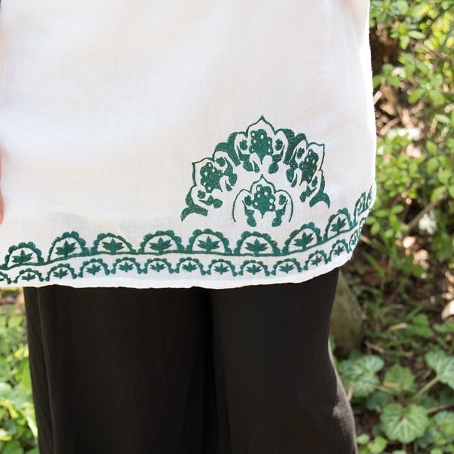 サフェード(白)をテーマにしたクルティが古都・ジャイプールより入荷しました。インド独特のチュニックで、サリーよりカジュアルに着こなせるクルティ。コットン製で、肌触りもよく通気性も良いので、暑い季節にもぴったり。胸元にはたっぷり花がらの刺繍が施されていて異国の雰囲気が漂います。個性的なアクセサリー等と合わせてエキゾチックに着こなして下さい。■サイドにはスリットも。