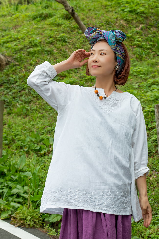 白い糸で刺繍がされていますが、とてもやさしい感じで気に入りました。タイトなパンツでも、ロングスカートでも合わせやすい着丈です。白ですが思ったほどの透け感はありません。色違いを購入しようか検討中です。