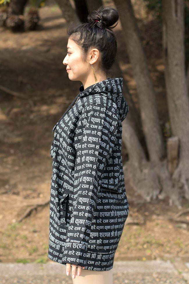 コットンなので通気性に富んでおり暑すぎないので、春秋にぴったりの一枚。普段着として着れますよ。前のジッパーを閉じてぴったりさせても、オープンしてリラックスした着方もどちらも楽しめちゃいます!試着したティラキタスタッフもお気に入りの1枚となりました。男女問わずお楽しみいただける便利な1枚です。シャツに描かれているマントラは、クリシュナ神を称えるもの。数多くの愛を集めた、ロマンティックな神様です。