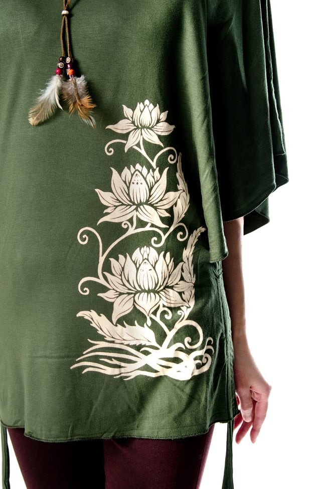 ロータス柄が大胆にプリントされた、バタフライスリーブのTシャツです。大きく開いた袖口は、ヒラヒラと蝶が舞うようなデザイン。軽やかに揺れて、女性らしさをしなやかに演出します。動きやすいストレッチ素材なので、ヨガウェアにはもちろん普段遣いにも活躍してくれます。■柔らかな質感が着心地良い