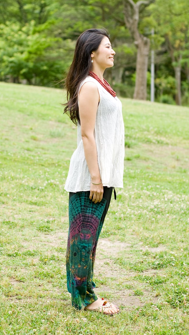 タイダイ染めがインパクトのある、履き心地最高のレーヨンパンツです。さらさらしたレーヨン素材なので履き心地は爽やかで、足にまとわりつかず本当に気持ちが良いです。あまりの気持ちよさに、一度はいたら病み付きになるスタッフも多数いるほどです!さすが暑い国、タイから来ただけはあります。タイの人は蒸し暑い季節にピッタリのものをよ〜く知っていますね!
