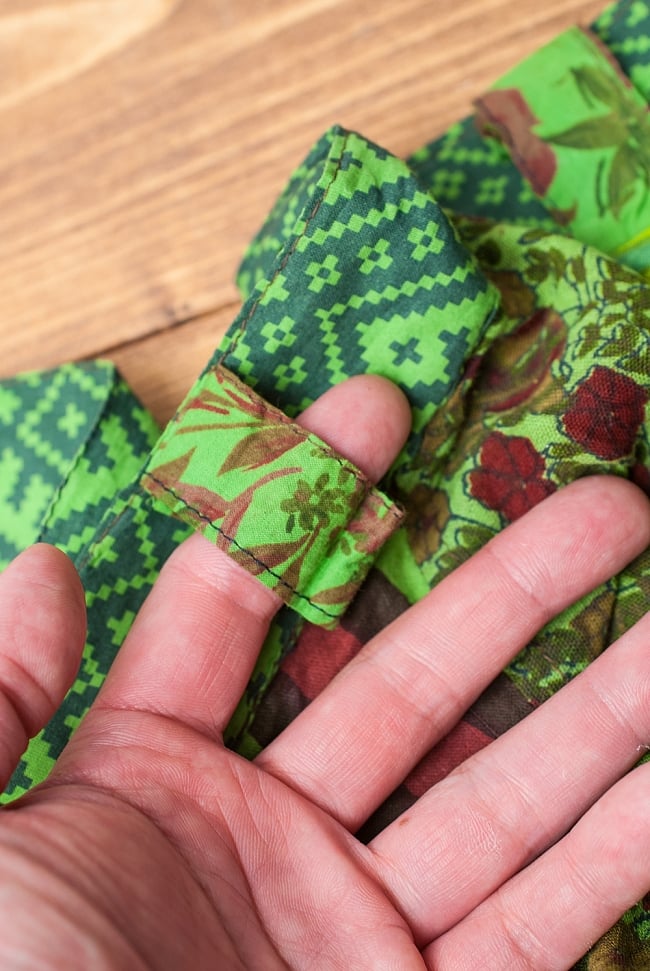 近くで生地をみてみました。パッチワークですので、柄は一点ごとに異なります。アソートでのお届けとなります。