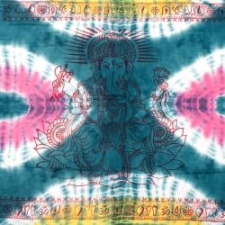 〔195cm*100cm〕ガネーシャ&ヒンドゥー神様のタイダイサイケデリック布 - 青緑×ピンク×黄色系