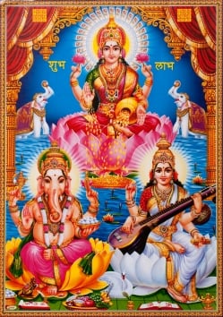 〔約39.2cm×約27.5cm〕インドのヒンドゥー神様ポスター - ラクシュミー・サラスヴァティ・ガネーシャ