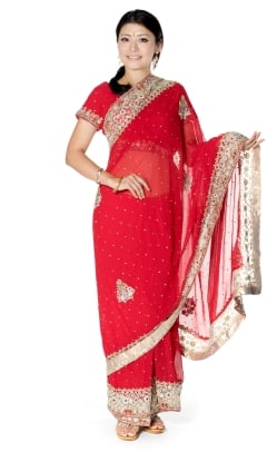 【一点物】刺繍とビジューの婚礼用ゴージャス ジョーゼットサリー【チョリ付き】 - 赤