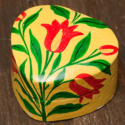 カシミールのペーパーマッシュ - ハート型花がらイエロー小物入れ[小]