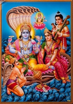 〔約39.2cm×約27.5cm〕インドのヒンドゥー神様ポスター - ヴィシュヌ・ラクシュミー・ブラフマー