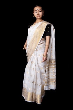 ケララの白いサリー ゴージャス ゴールデン 刺繍入り ケララカサヴ
