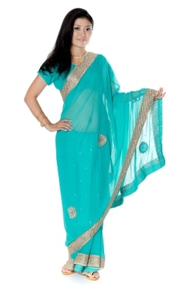 金糸とビーズ刺繍のジョーゼットインドサリー【チョリ付き】 - ターコイズグリーン