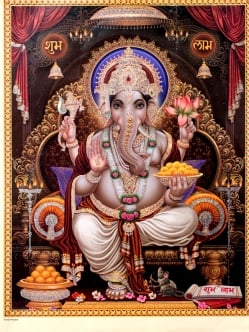 〔約40.5cm×約30.5cm〕輝くラメ入り・インドのヒンドゥー神様ポスター - ガネーシャ 学問と商売の神様