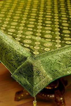 〔約105cm×105cm〕インドの金糸入りテーブルカバー - グリーン×唐草