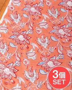 【3個セット】〔1m単位切り売り〕ジャイプル 職人手作り木版染め 色彩美しいボタニカルデザイン〔幅約109cm〕〔サーモンオレンジ系 更紗柄〕 おしゃれ 生地 テーブルクロス 手芸素材などへ