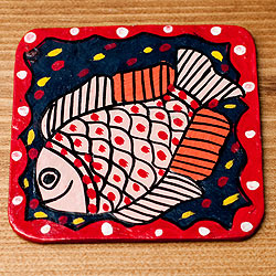 〔四角形〕 ミティラー画のコースター - 赤色枠 薄ピンクお魚