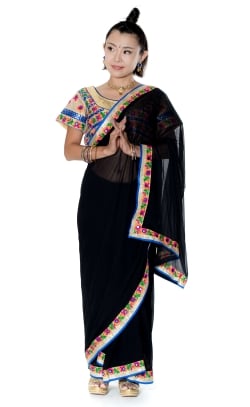 カッチ刺繍テイストのジョーゼットインドサリー【チョリ付き】 - 黒