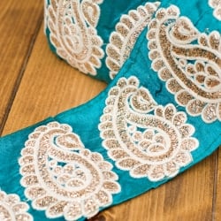 金糸ペイズリー柄チロリアンテープ(メーター売り・幅約8cm) - ターコイズグリーン