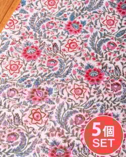 【5個セット】〔1m単位切り売り〕ジャイプル 職人手作り木版染め 色彩美しいボタニカルデザイン〔幅約110cm〕〔グリーン×ピンク系 更紗柄〕 おしゃれ 生地 テーブルクロス 手芸素材などへ