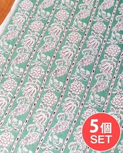 【5個セット】〔1m単位切り売り〕ジャイプル 職人手作り木版染め 色彩美しいボタニカルデザイン〔幅約111cm〕〔ミントグリーン系 更紗柄〕 おしゃれ 生地 テーブルクロス 手芸素材などへ
