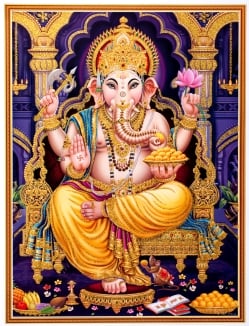 〔約40.5cm×約30.5cm〕輝くラメ入り・インドのヒンドゥー神様ポスター - ガネーシャ 学問と商売の神様