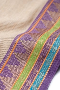 〔1m単位切り売り〕南インドのハーフボーダー・シンプル・コットン生地 - アイボリー×パープルボーダー〔幅約110cm〕