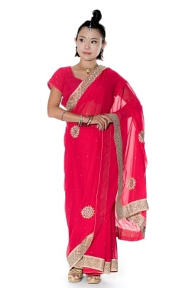 金糸とビーズ刺繍のジョーゼットインドサリー【チョリ付き】 - 赤