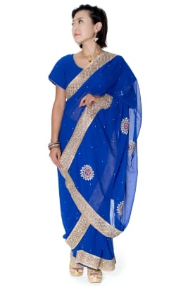 金糸とビーズ刺繍のジョーゼットインドサリー【チョリ付き】 - 青