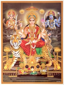 〔約30cm×約40cm〕輝くラメ入りインドのヒンドゥー神様ポスター - ドゥルガー