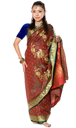 ベナレスのインドサリー【金糸刺繍】 赤×緑