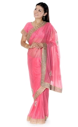 金糸とビーズ刺繍 レンガ模様のマハラニインドサリー【チョリ付き】 - ピンク
