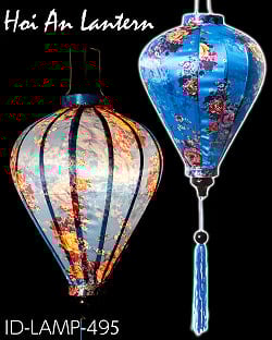 華やかな柄入り ベトナム伝統のホイアン・ランタン〔提灯〕 - ティアドロップ〔牡丹模様青〕