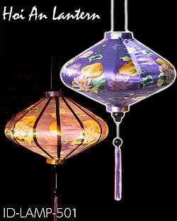 華やかな柄入り ベトナム伝統のホイアン・ランタン(提灯) - 薄ひし形〔睡蓮とノンラー模様紫〕