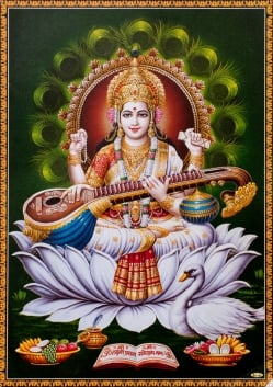 〔約39.2cm×約27.5cm〕インドのヒンドゥー神様ポスター - サラスヴァティ 音楽の神様